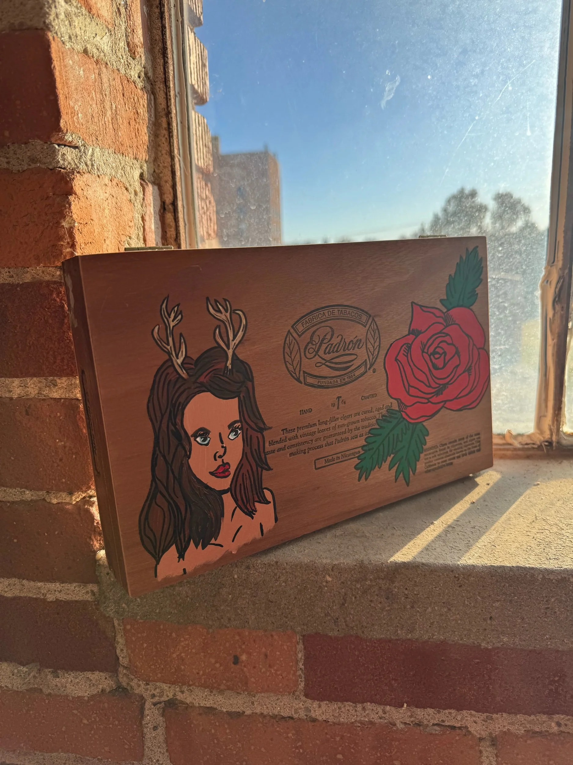 Image 1 of 4 Image 2 of 4 Image 3 of 4 Image 4 of 4 Deer Woman on Pardon Cigar Box $75.00 Upscaled Pardon Cigar Box measuring 11 1/2” x 1 3/4” x 7” featuring acrylic rose and deer woman. Add To Cart Added! Upscaled Pardon Cigar Box measuring 11 1/2” x 1 3/4” x 7” featuring acrylic rose and deer woman.